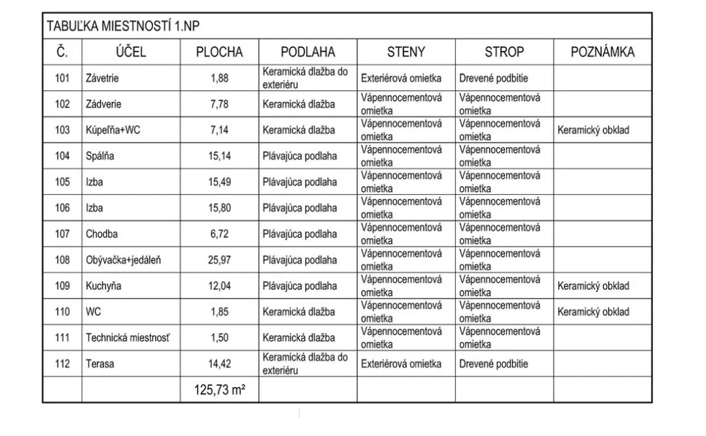 - Úžitková plocha: 127,73 m² (vrátane zastrešenej terasy 14,42 m²)